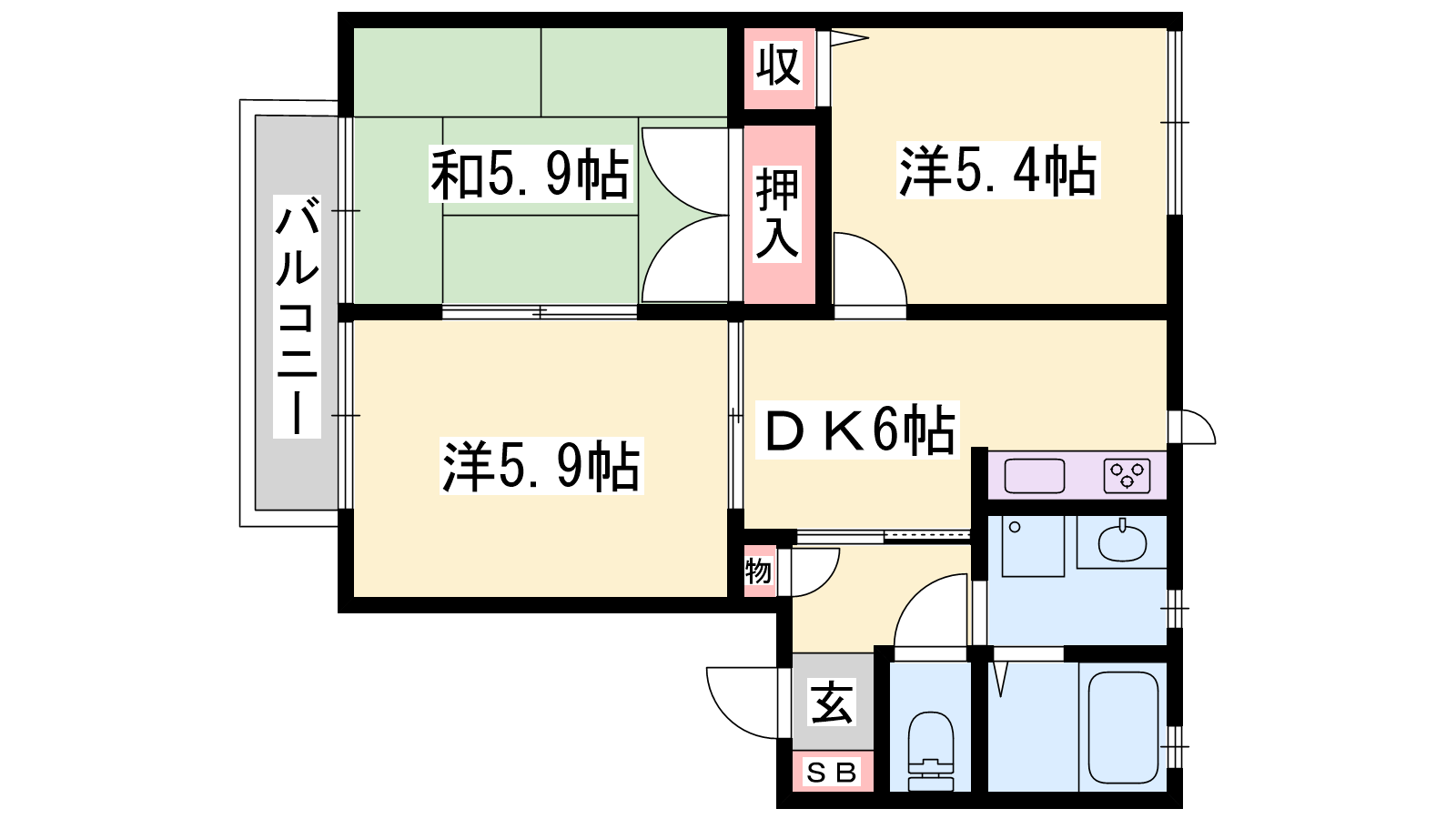 - DK6帖、洋室5.9帖、洋室5.4帖、和室5.9帖
