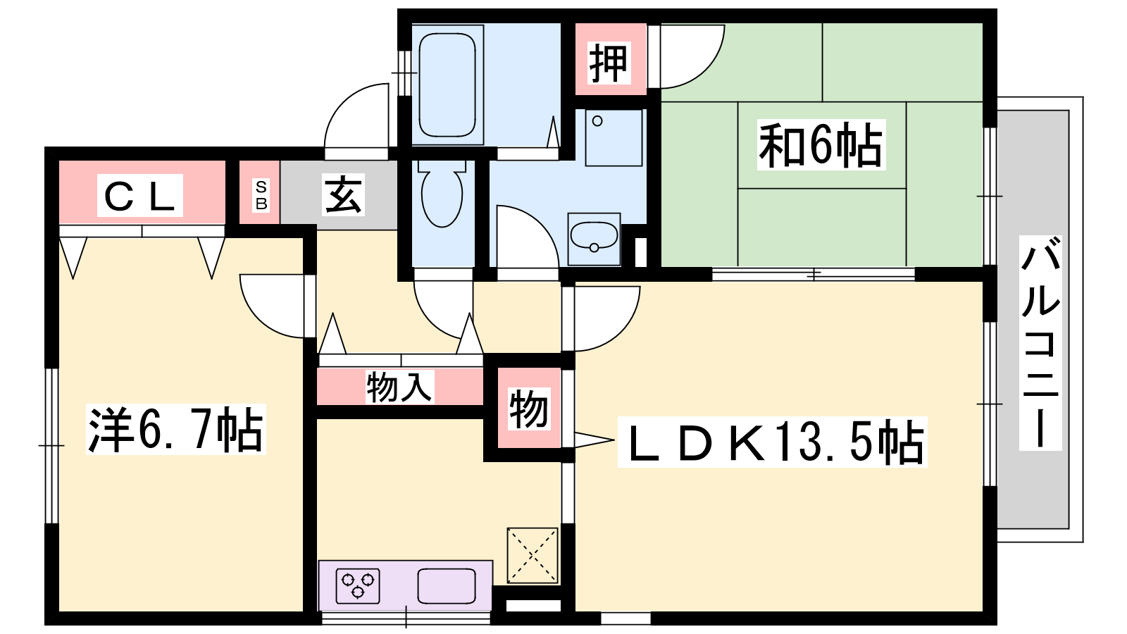 - LDK13.5帖、洋室6.7帖、和室6帖