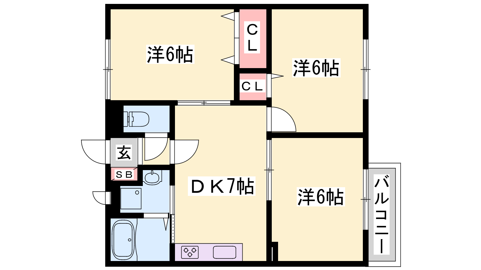 - DK7帖、洋室6帖、洋室6帖、洋室6帖