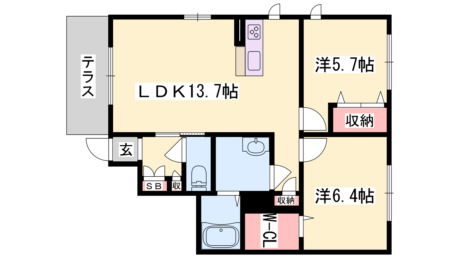 - LDK13.7帖、洋室6.4帖、洋室5.7帖
