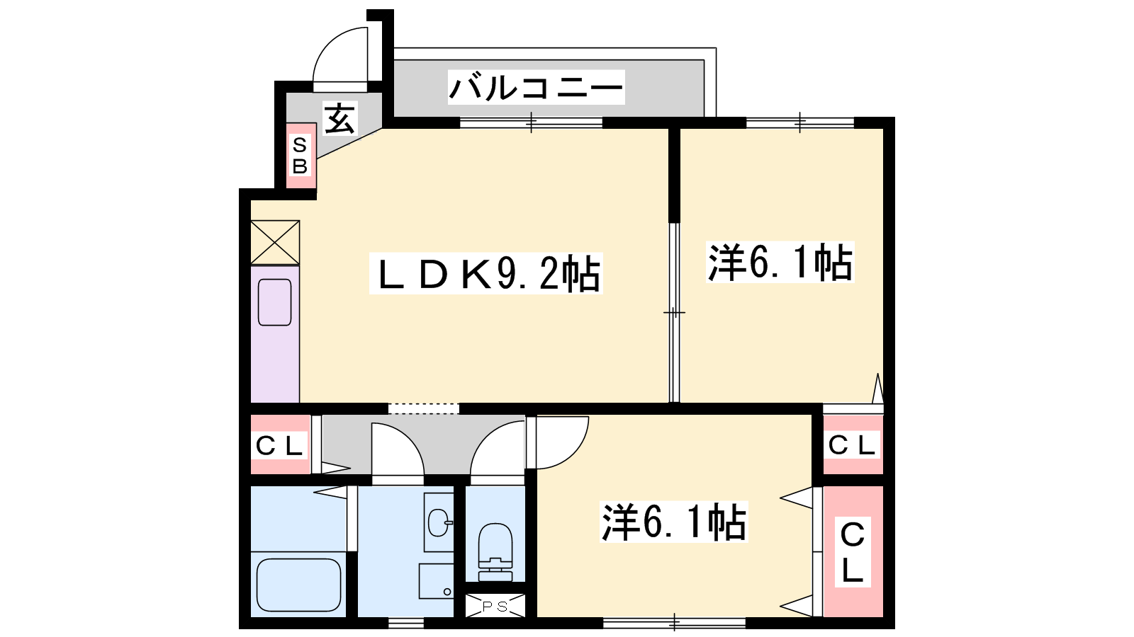- LDK9.2帖、洋室6.1帖、洋室6.1帖