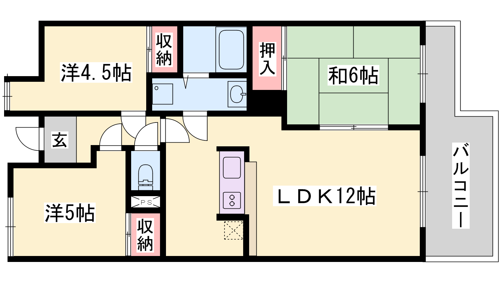 - LDK12帖、洋室5帖、洋室4.5帖、和室6帖