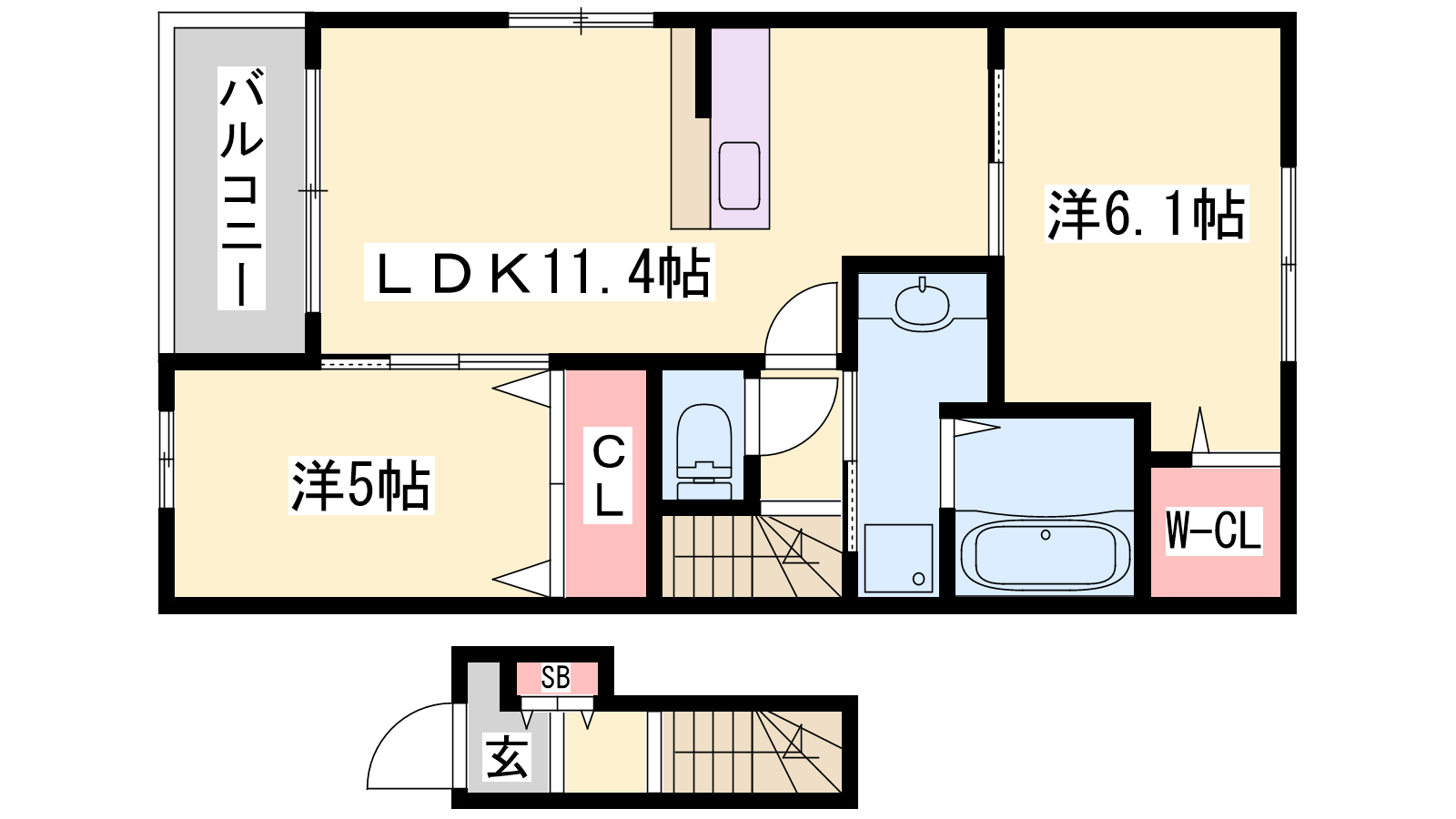 - LDK11.4帖、洋室6.1帖、洋室5帖