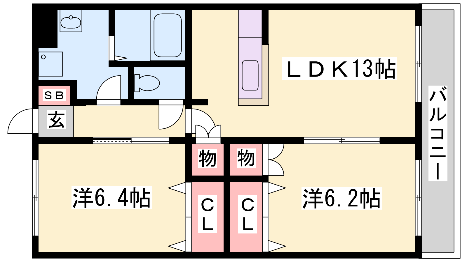 - LDK13帖、洋室6.4帖、洋室6.2帖