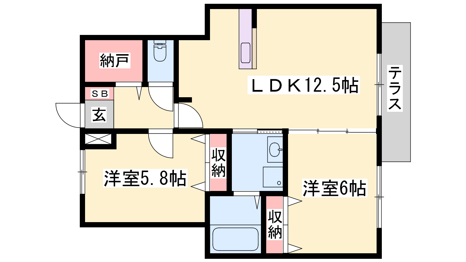 - LDK12.5帖、洋室6帖、洋室5.8帖