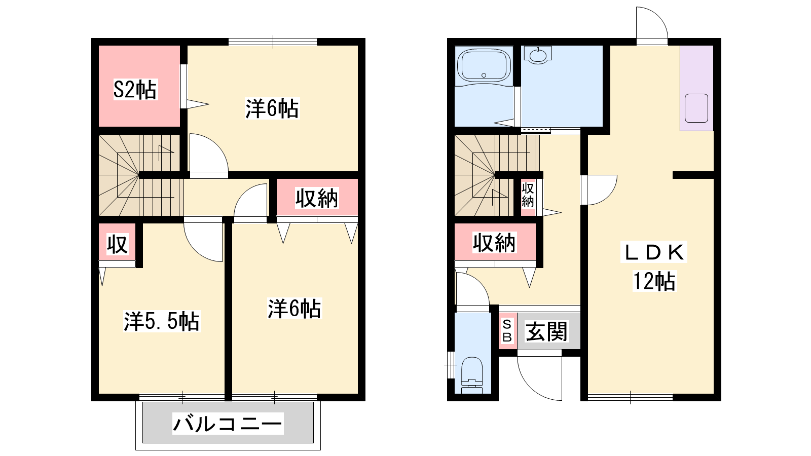 - LDK12帖、洋室6帖、洋室6帖、洋室5.5帖、S2帖