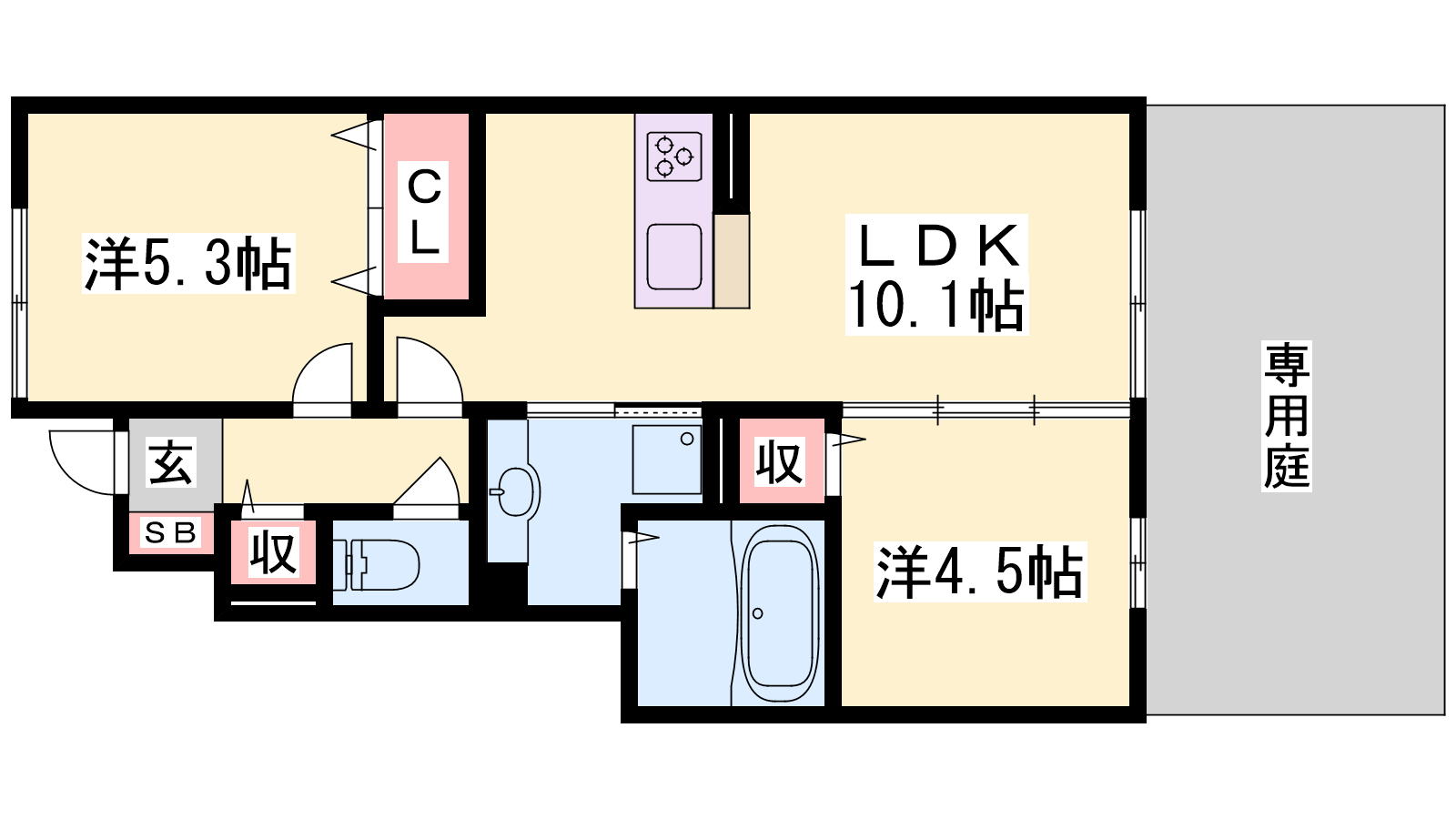 - LDK10.1帖、洋室5.3帖、洋室4.5帖