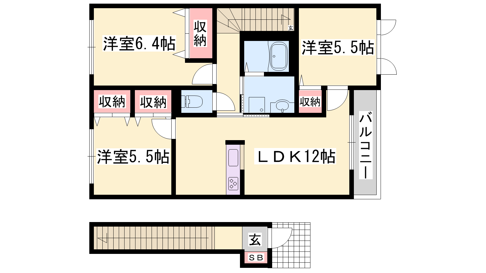 - LDK12帖、洋室5.5帖、洋室5.5帖、洋室6.4帖