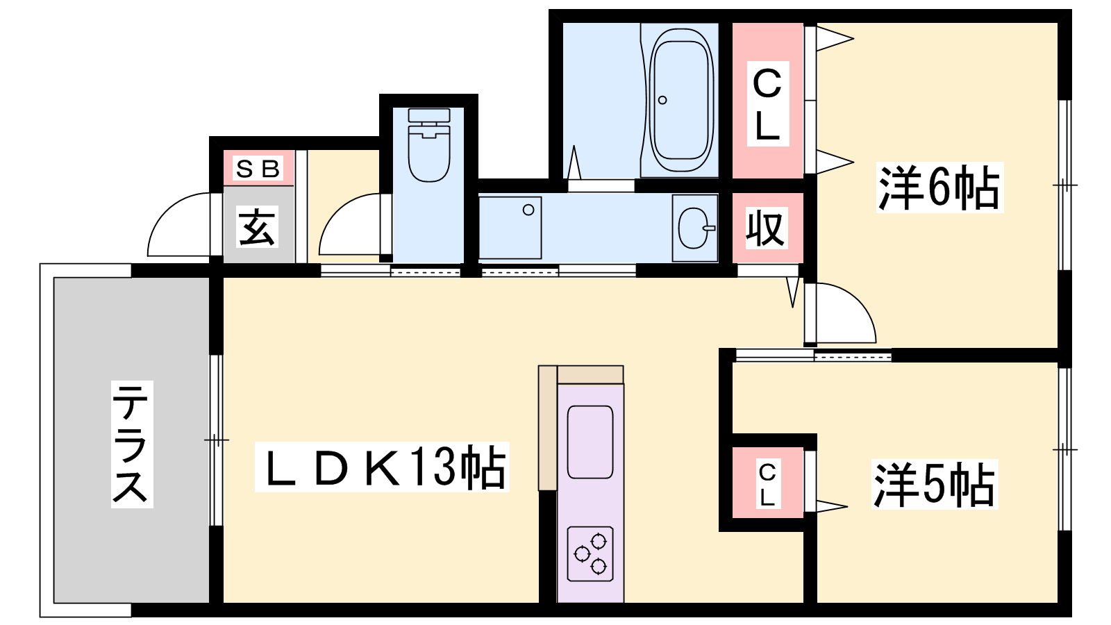 - LDK12.9帖、洋室6帖、洋室5帖