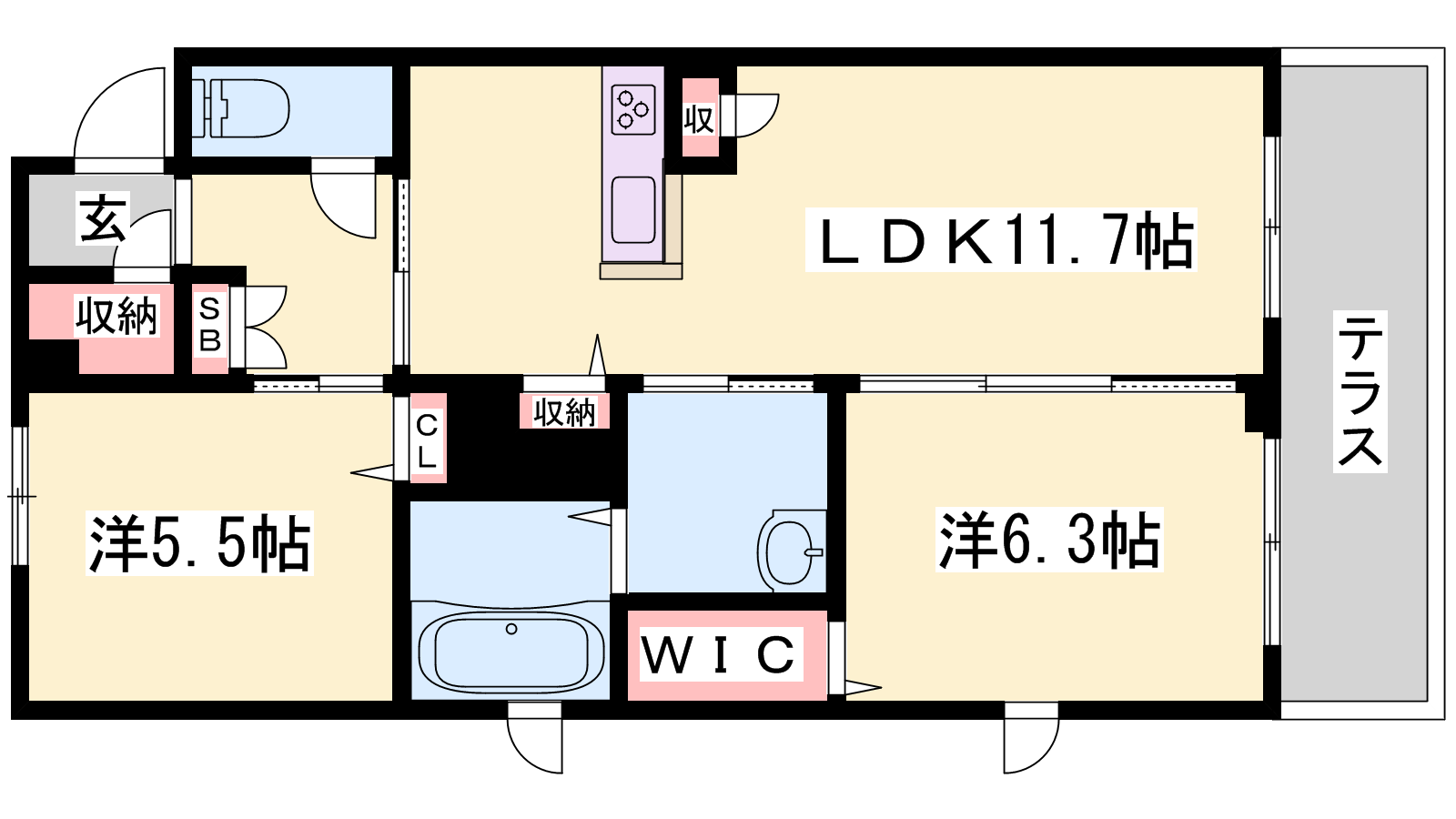 - LDK11.7帖、洋室6.3帖、洋室5.5帖