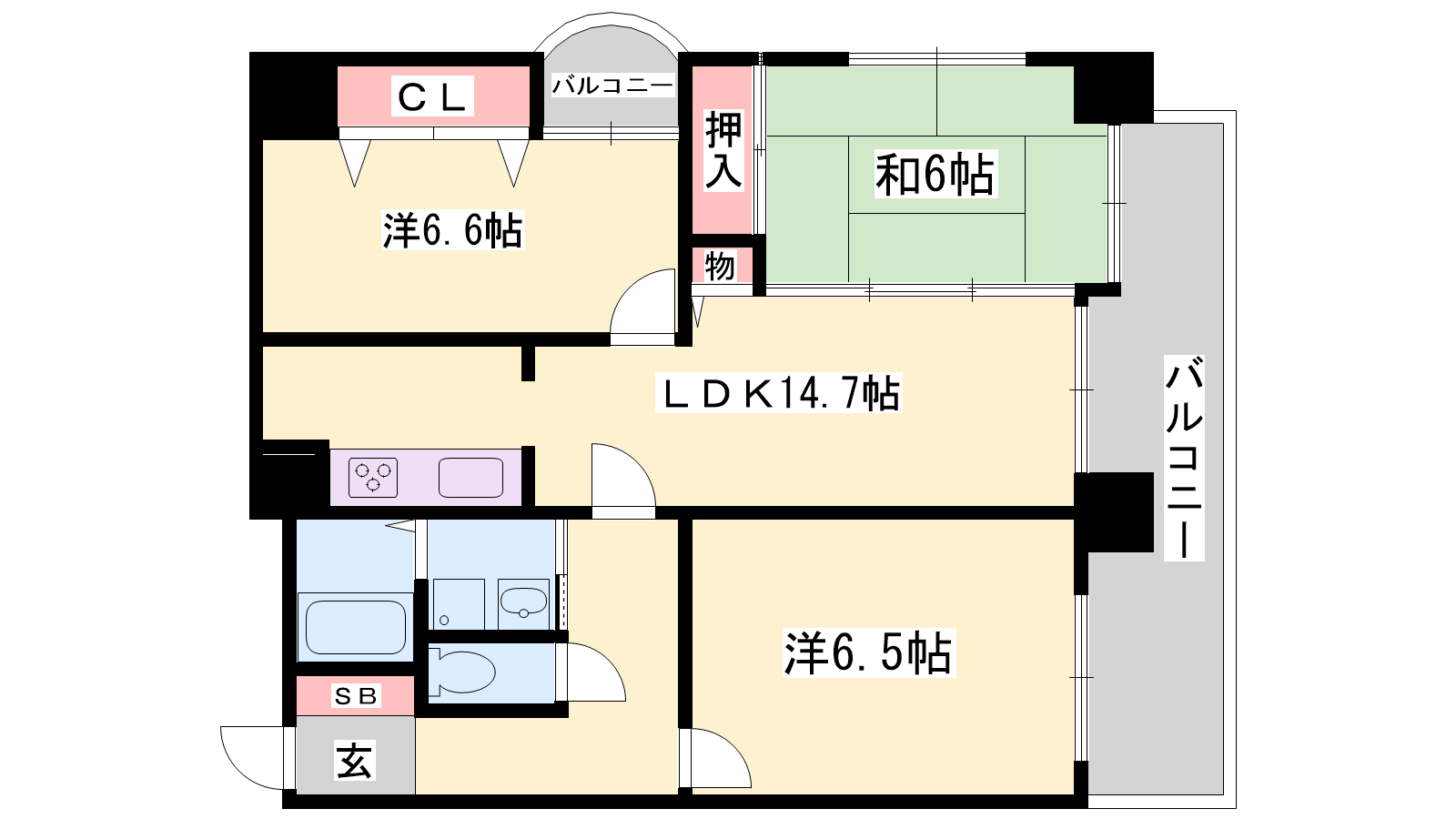 - LDK14.7帖、洋室6.6帖、洋室6帖、和室6帖