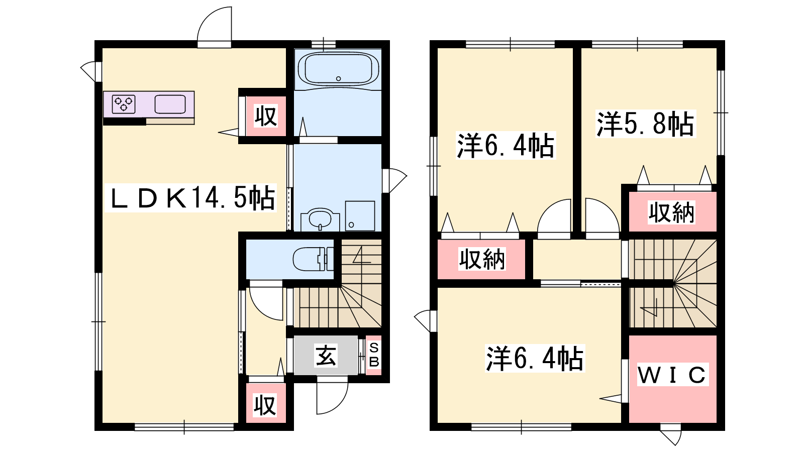 - LDK14.5帖、洋室6.4帖、洋室6.4帖、洋室5.8帖