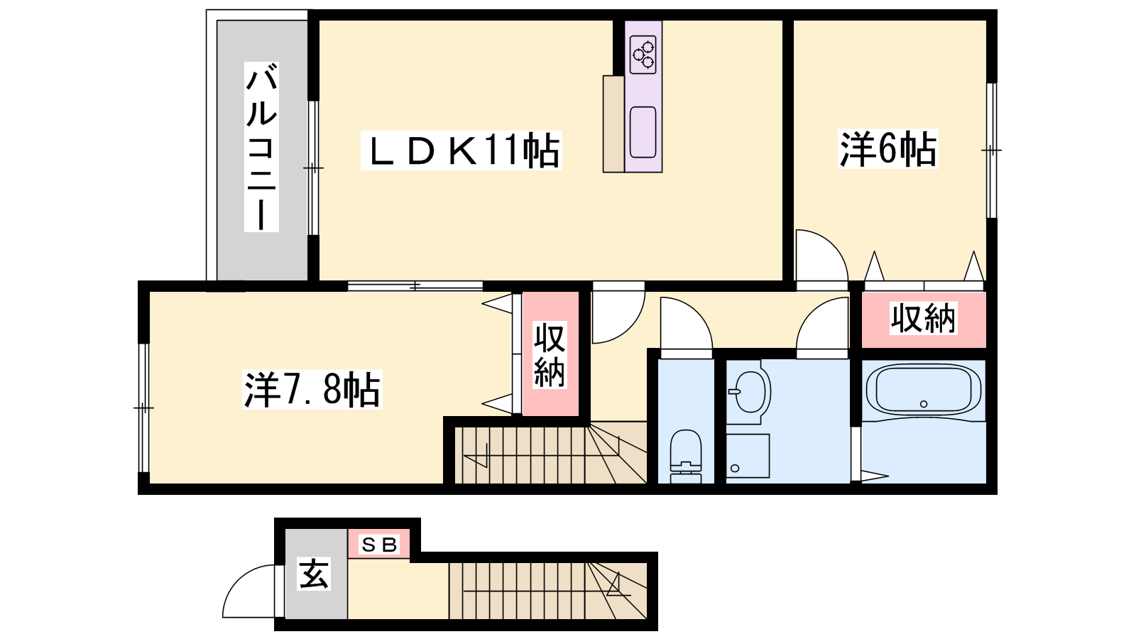 - LDK11帖、洋室7.8帖、洋室6帖