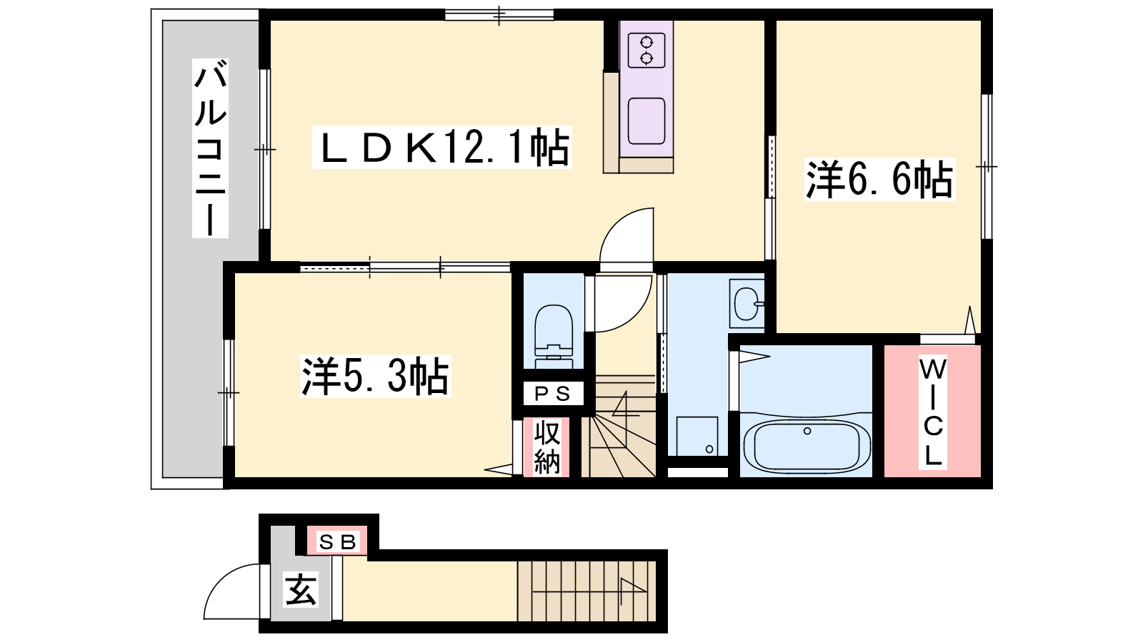 - LDK12.1帖、洋室6.6帖、洋室5.3帖