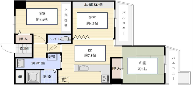 - DK7.8帖、洋室5.5帖、洋室4.7帖、和室6帖