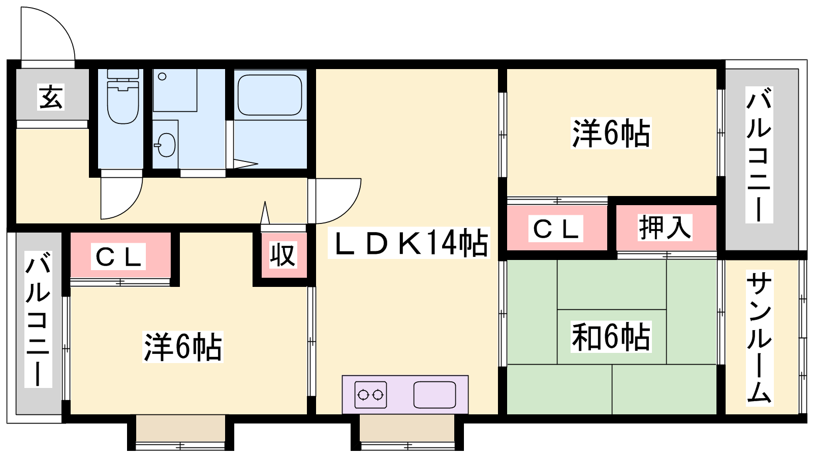 - LDK14帖、洋室6帖、洋室6帖、和室6帖