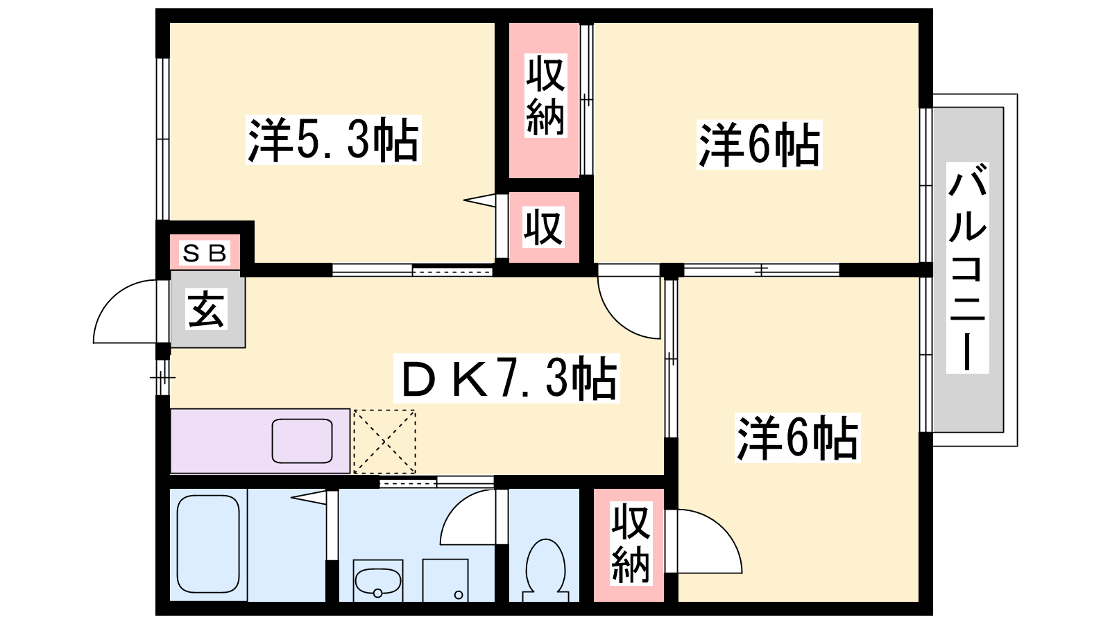 - DK7.3帖、洋室6帖、洋室6帖、洋室5.3帖