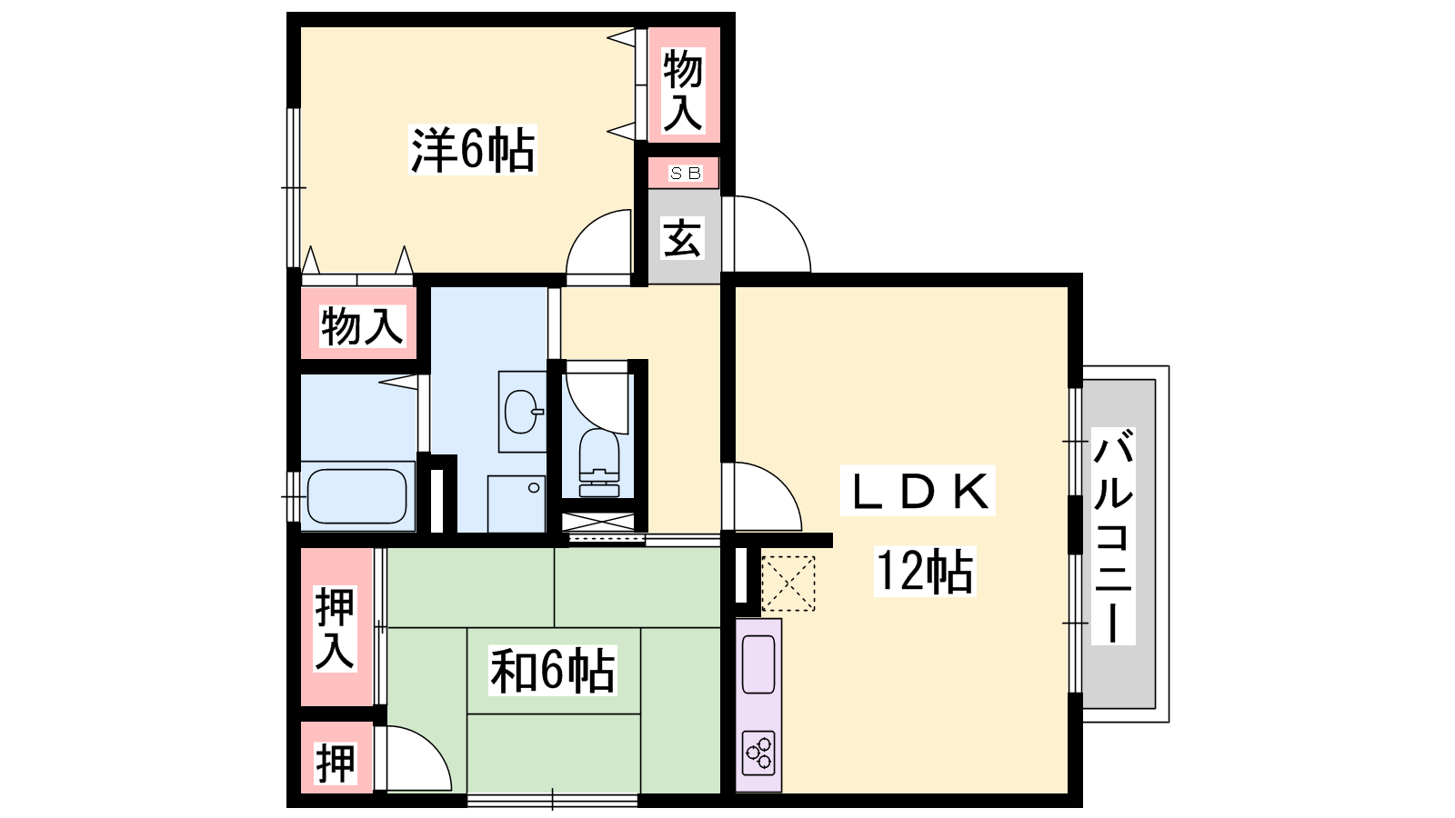 - LDK12帖、洋室6帖、和室6帖