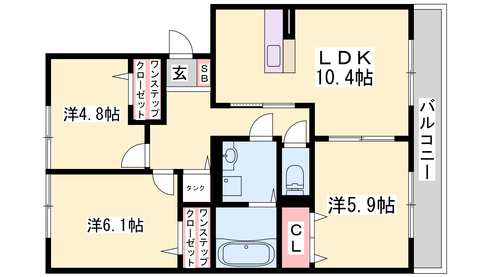- LDK10.4帖、洋室6.1帖、洋室5.9帖、洋室4.8帖