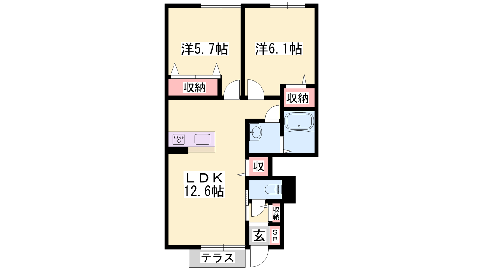 - LDK12.6帖、洋室5.7帖、洋室6.1帖