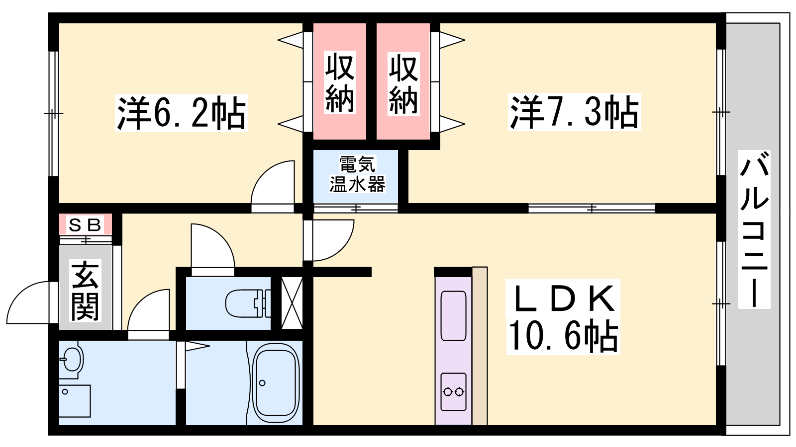 - LDK10.6帖、洋室7.3帖、洋室6.2帖