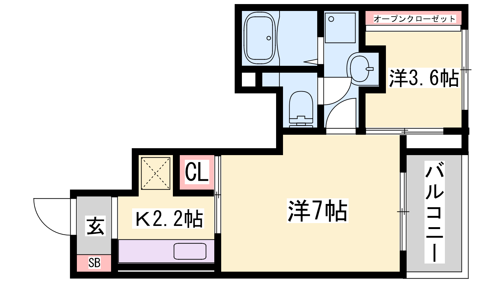 - K2.2帖、洋室7帖、S3.6帖