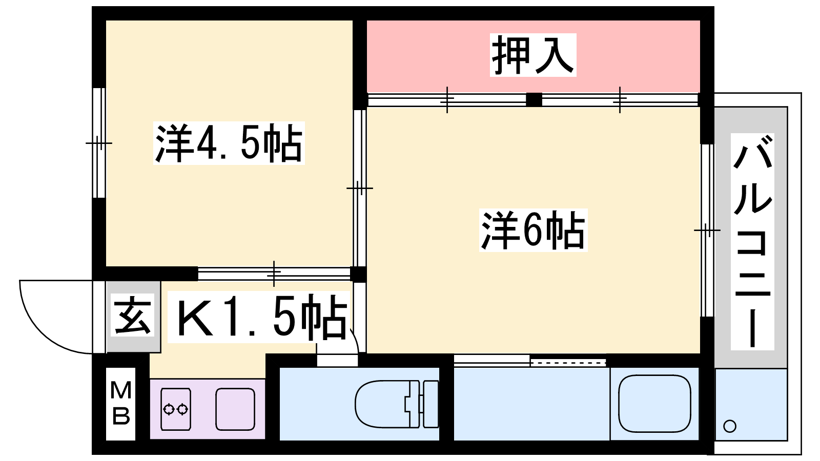 - K1.5帖、洋室6帖、洋室4.5帖