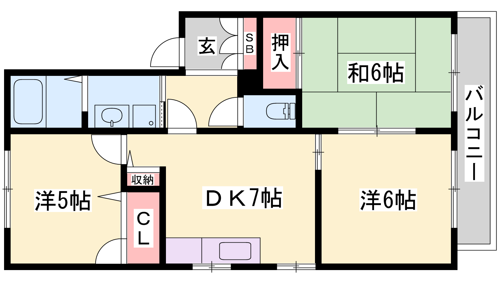 - DK7帖、洋室6帖、洋室5帖、和室6帖