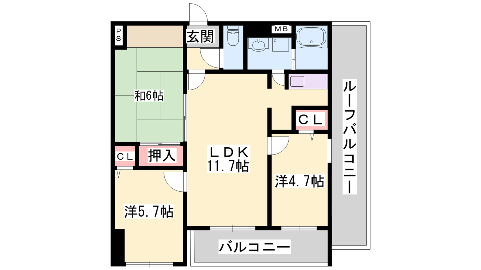 - LDK11.7帖、洋室5.7帖、洋室4.7帖、和室6帖