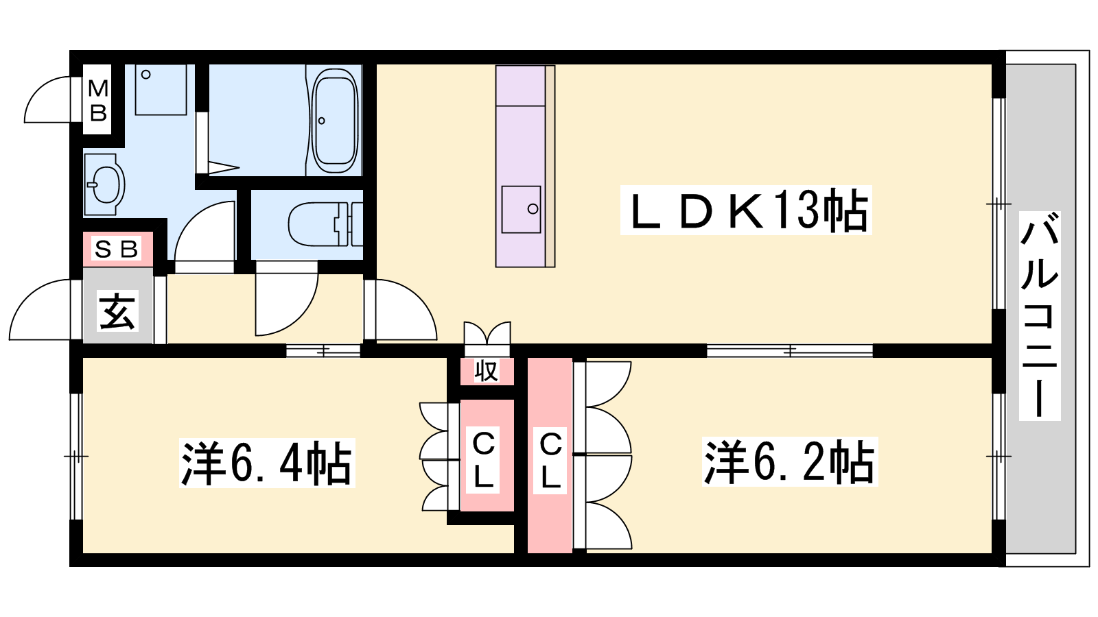 - LDK13帖、洋室6.4帖、洋室6.2帖