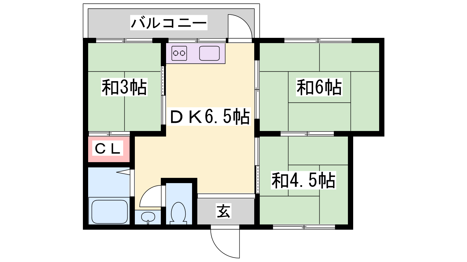 - DK6.5帖、洋室6帖、洋室4.5帖、和室3帖