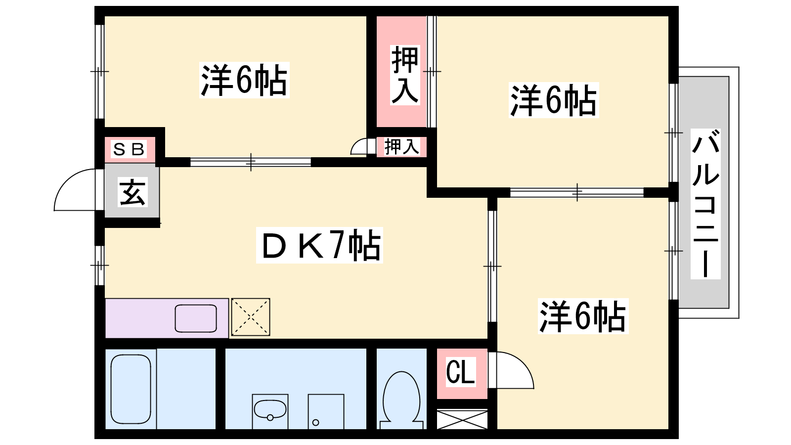 - DK7帖、洋室6帖、洋室6帖、洋室6帖