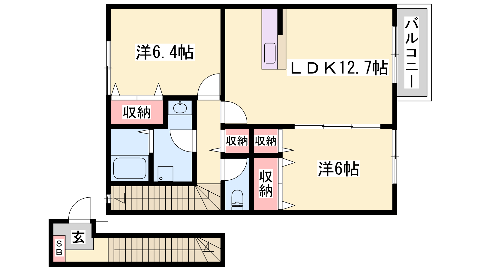 - LDK12.7帖、洋室6.4帖、洋室6帖