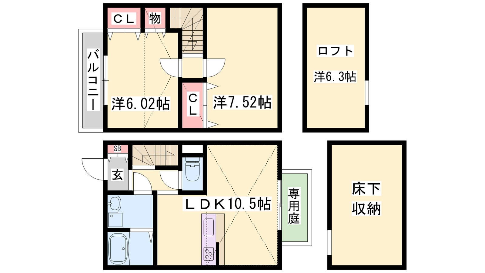 - LDK10.5帖、洋室7.52帖、洋室6.02帖
