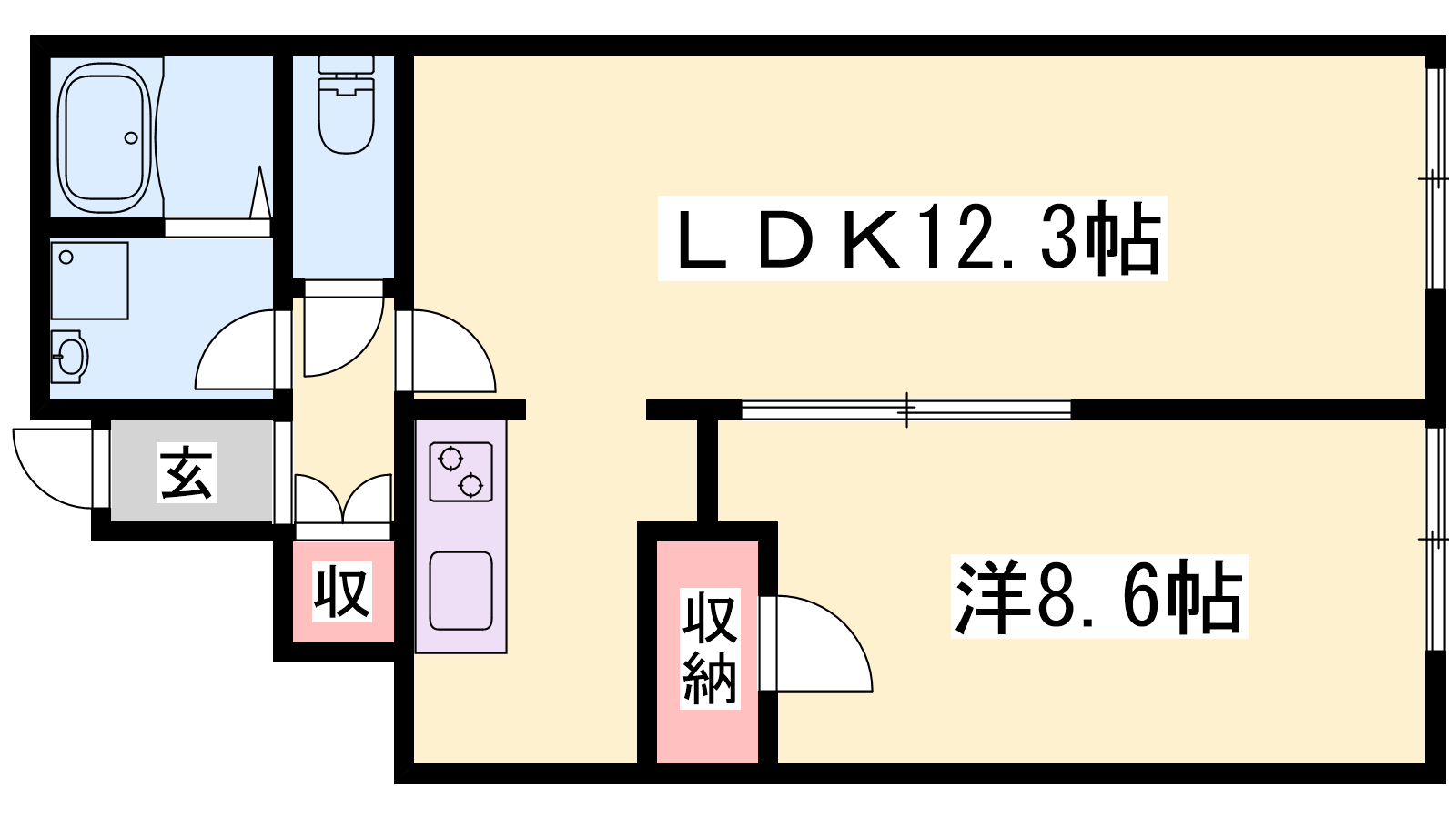 - LDK12.3帖、洋室8.6帖