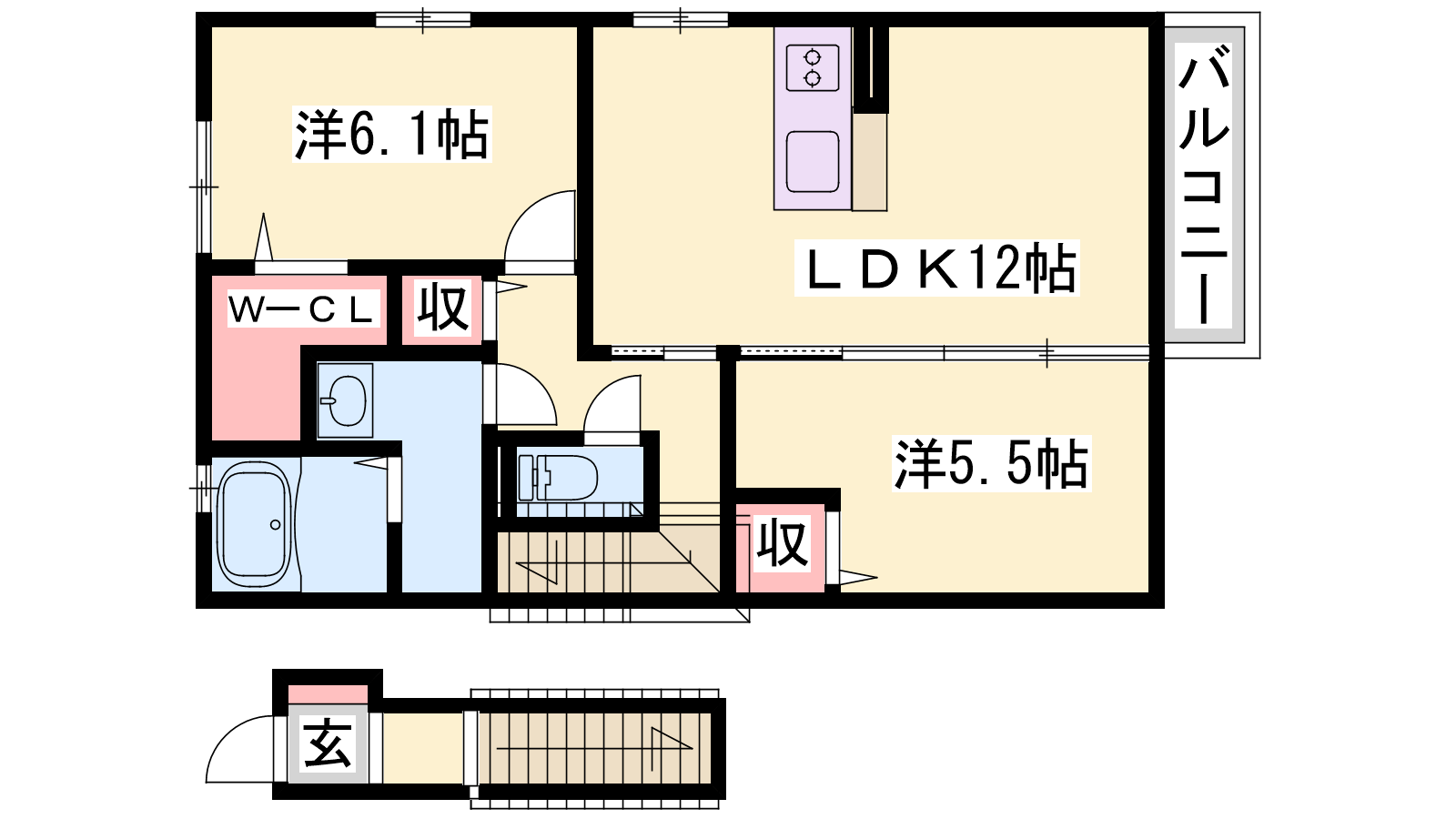 - LDK12帖、洋室6.1帖、洋室5.5帖