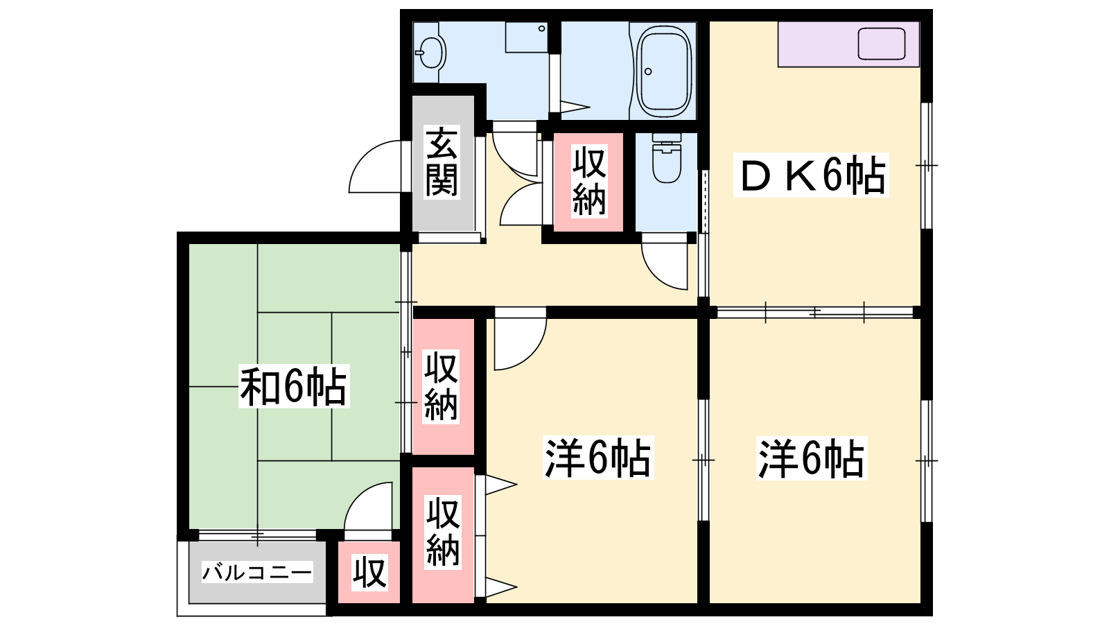 - DK6帖、洋室6帖、洋室6帖、和室6帖