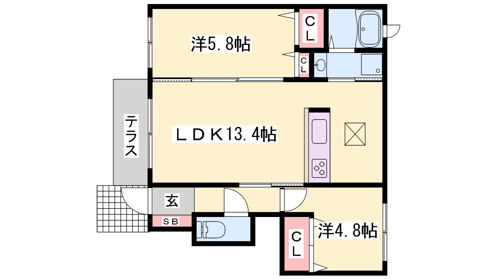 - LDK13.4帖、洋室5.8帖、洋室4.8帖