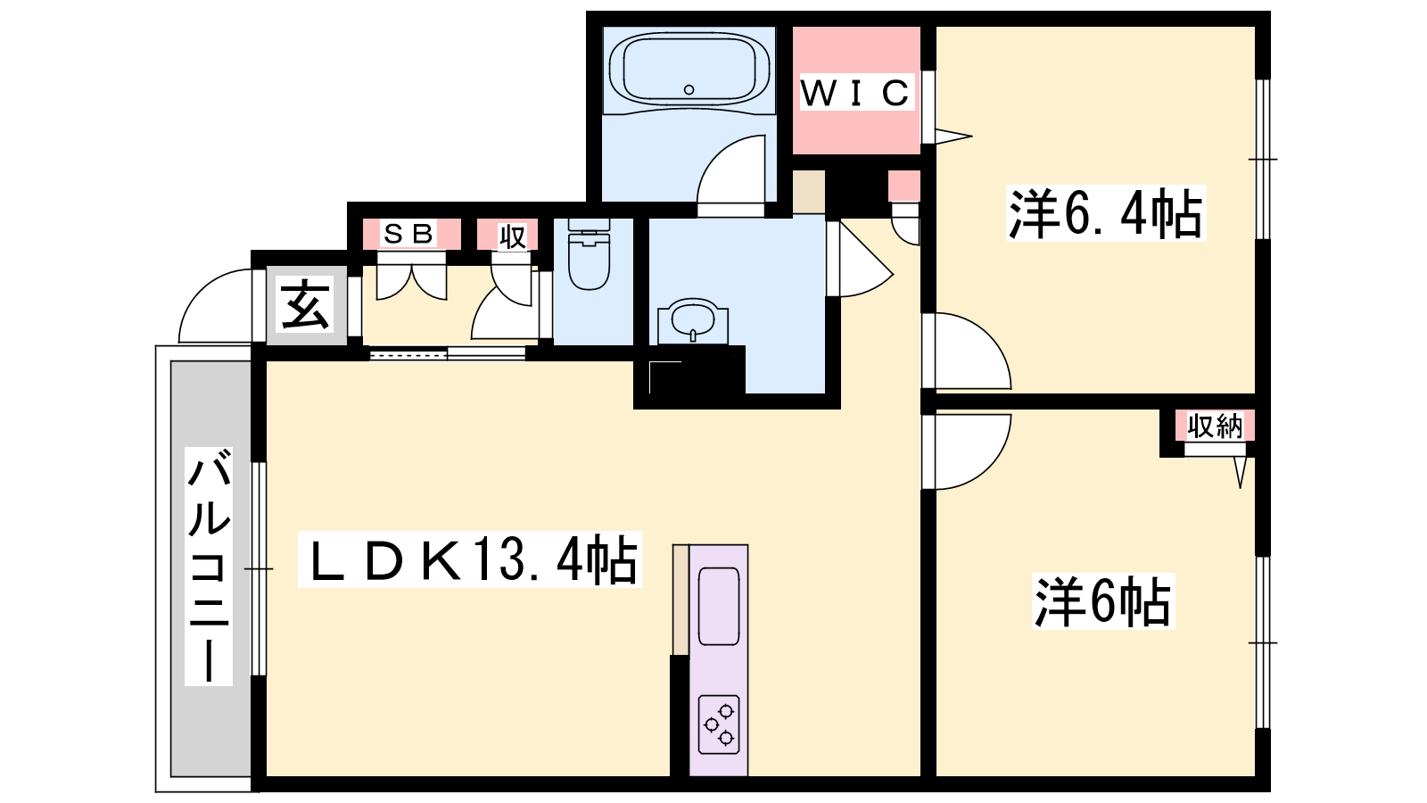 - LDK13.4帖、洋室6.4帖、洋室6帖