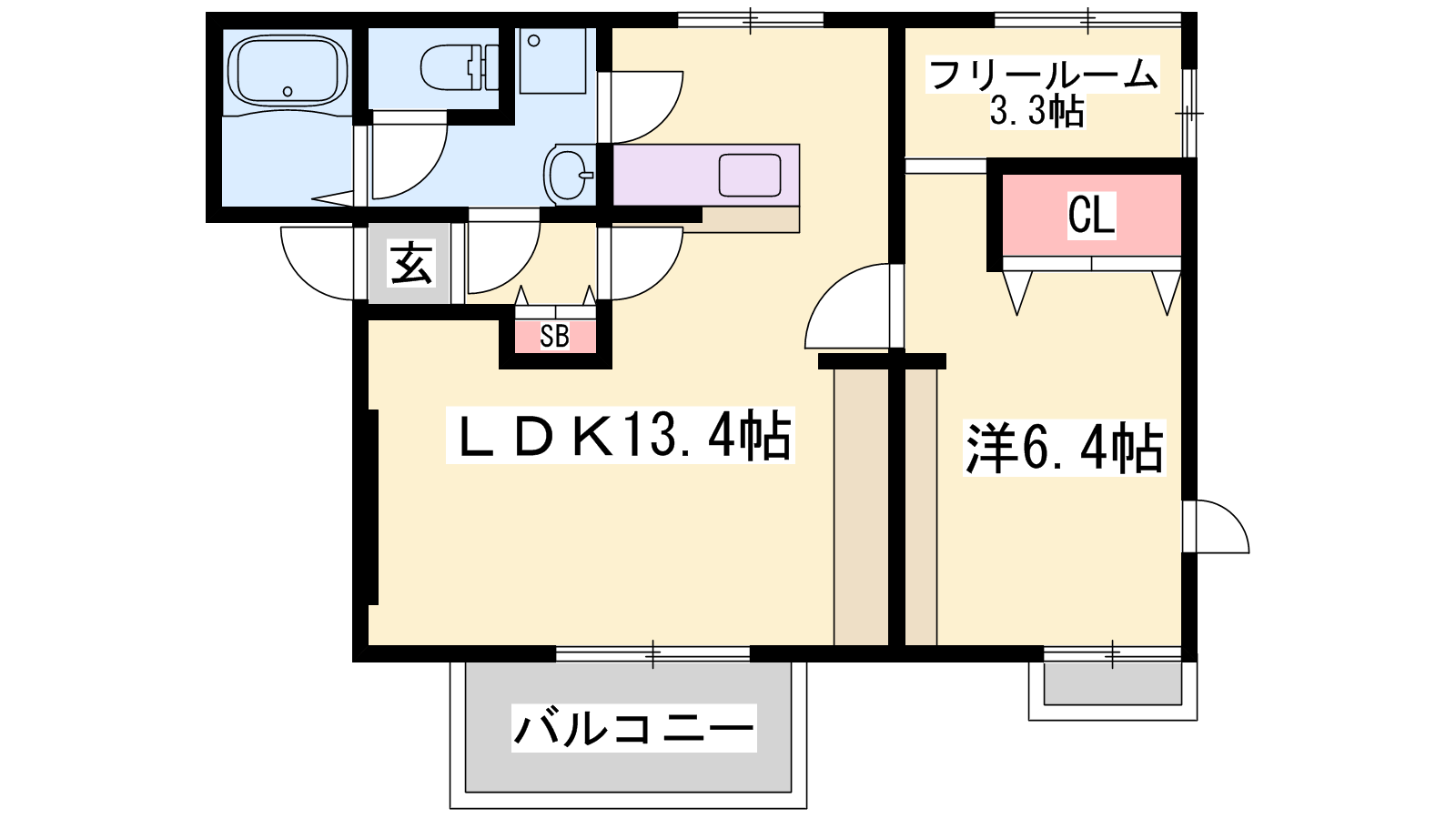 - LDK13.4帖、洋室6.4帖、S3.3帖