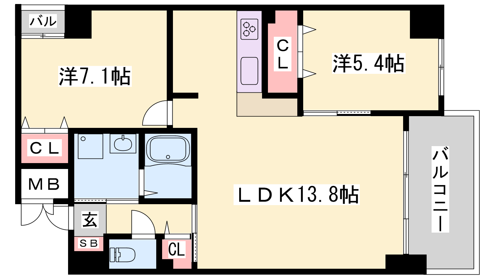 - LDK13.8帖、洋室7.1帖、洋室5.4帖