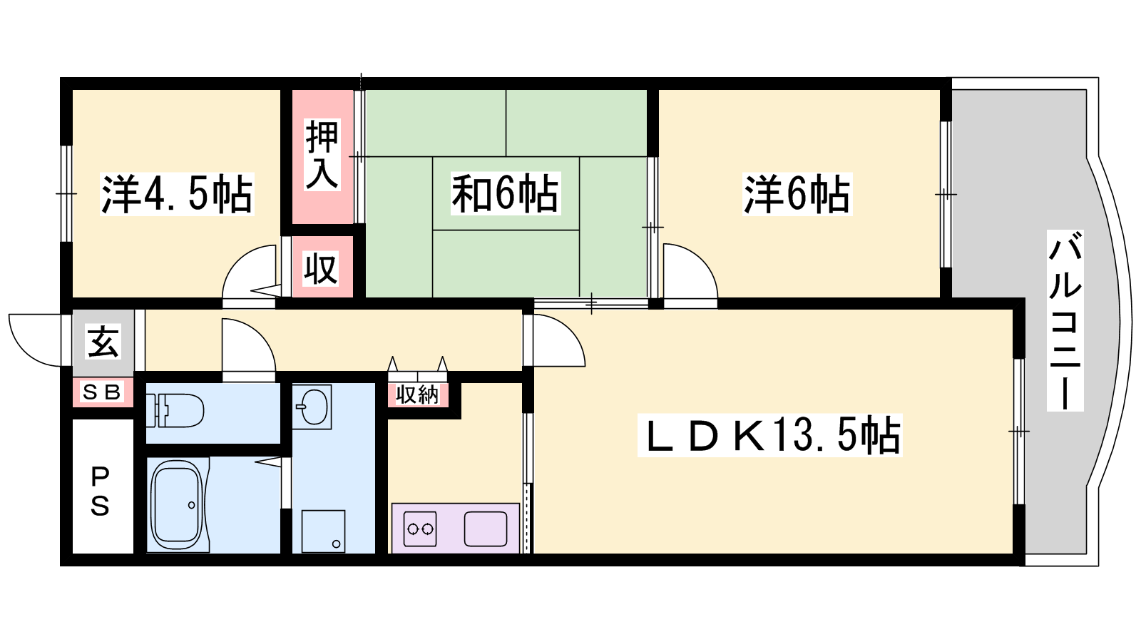- LDK13.5帖、洋室6帖、洋室4.5帖、和室6帖
