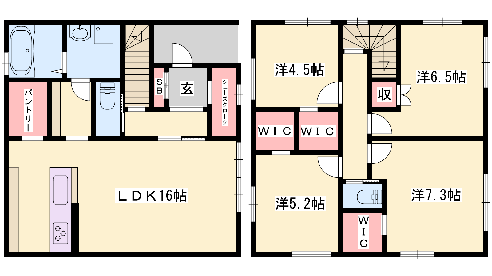 - LDK16帖、洋室7.3帖、洋室6.5帖、洋室5.2帖、洋室4.5帖