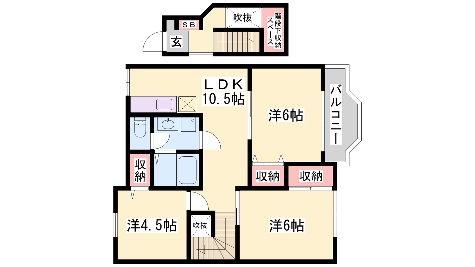 - LDK10.5帖、洋室6帖、洋室4.5帖、和室6帖