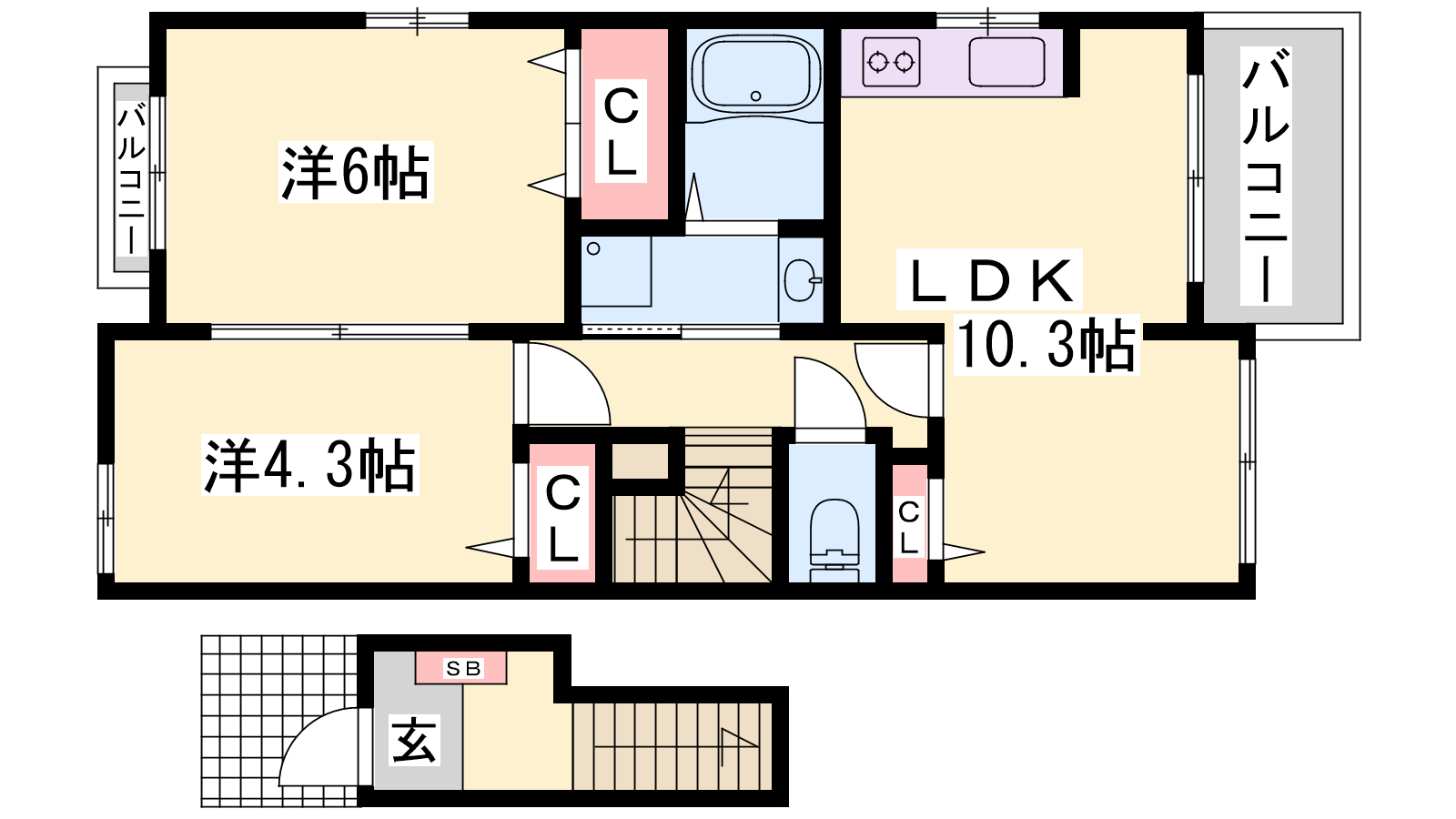 - LDK10.3帖、洋室6帖、洋室4.3帖