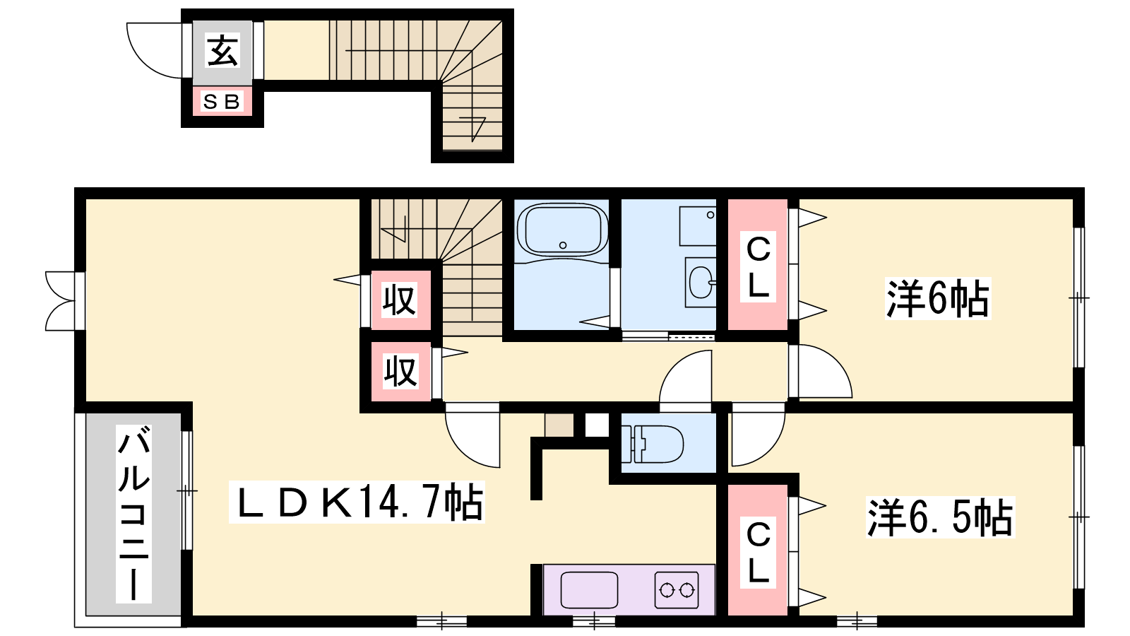 - LDK14.7帖、洋室6.5帖、洋室6帖