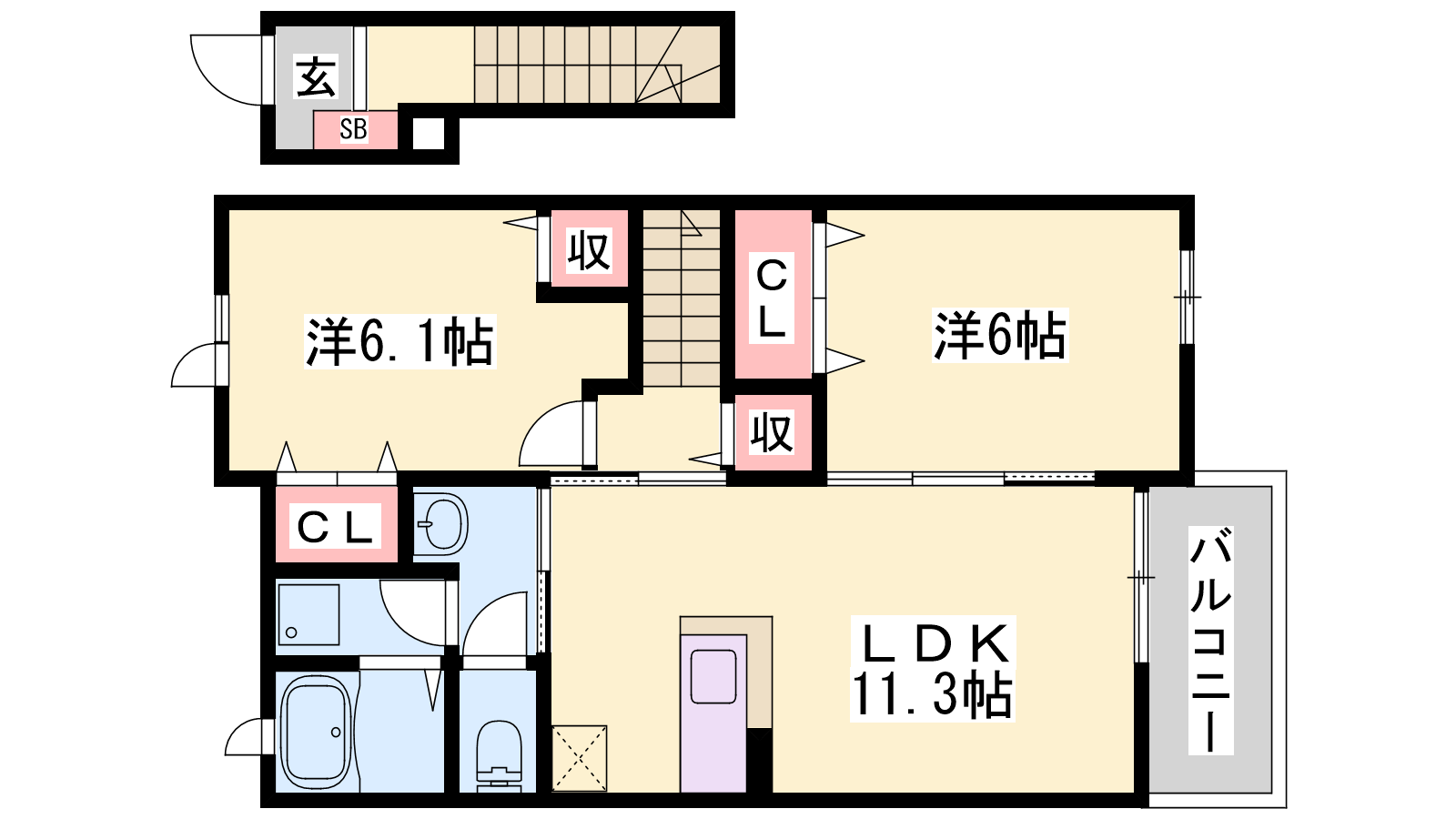 - LDK11.3帖、洋室6.1帖、洋室6帖