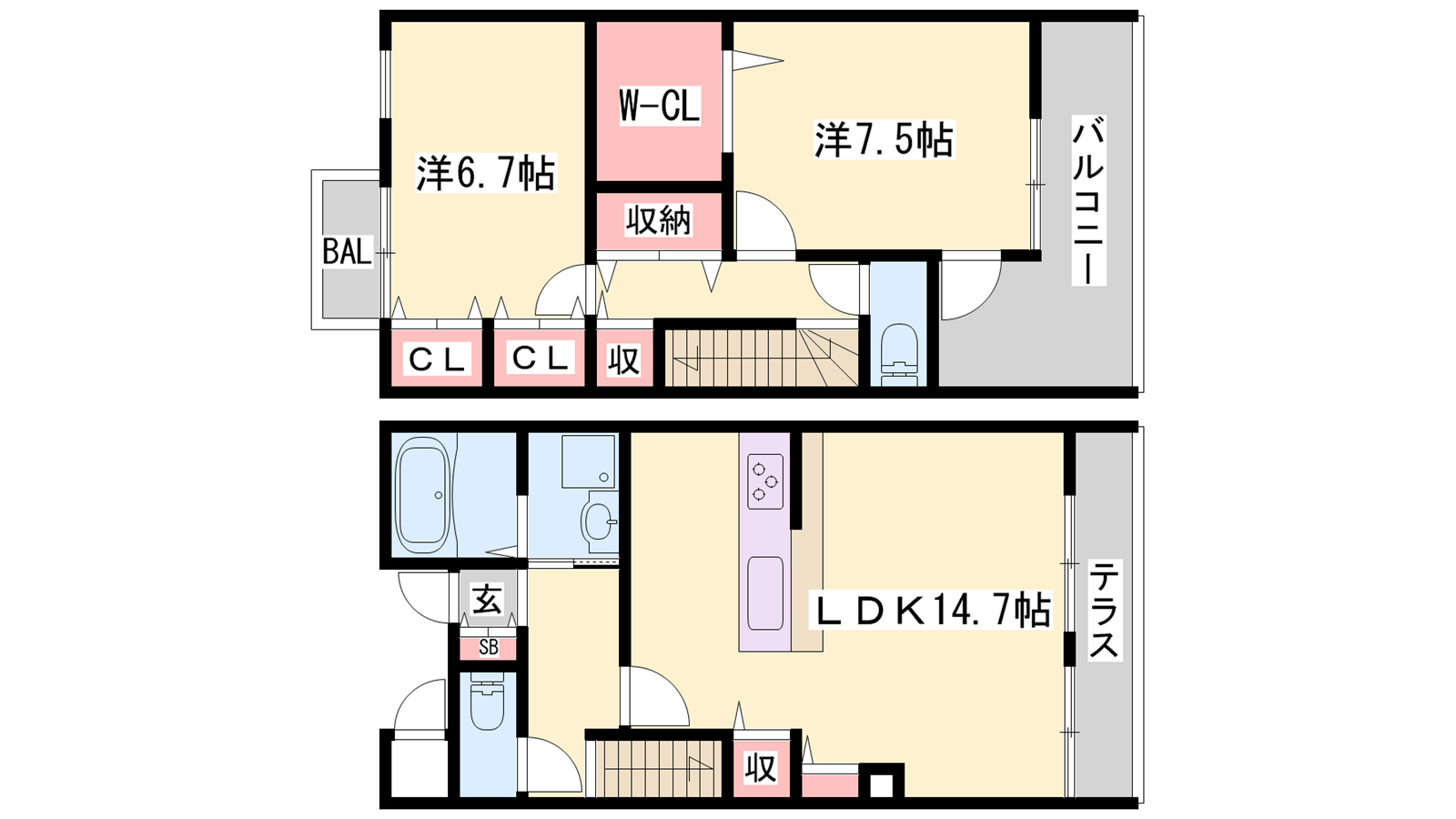 - LDK14.7帖、洋室7.5帖、洋室6.7帖