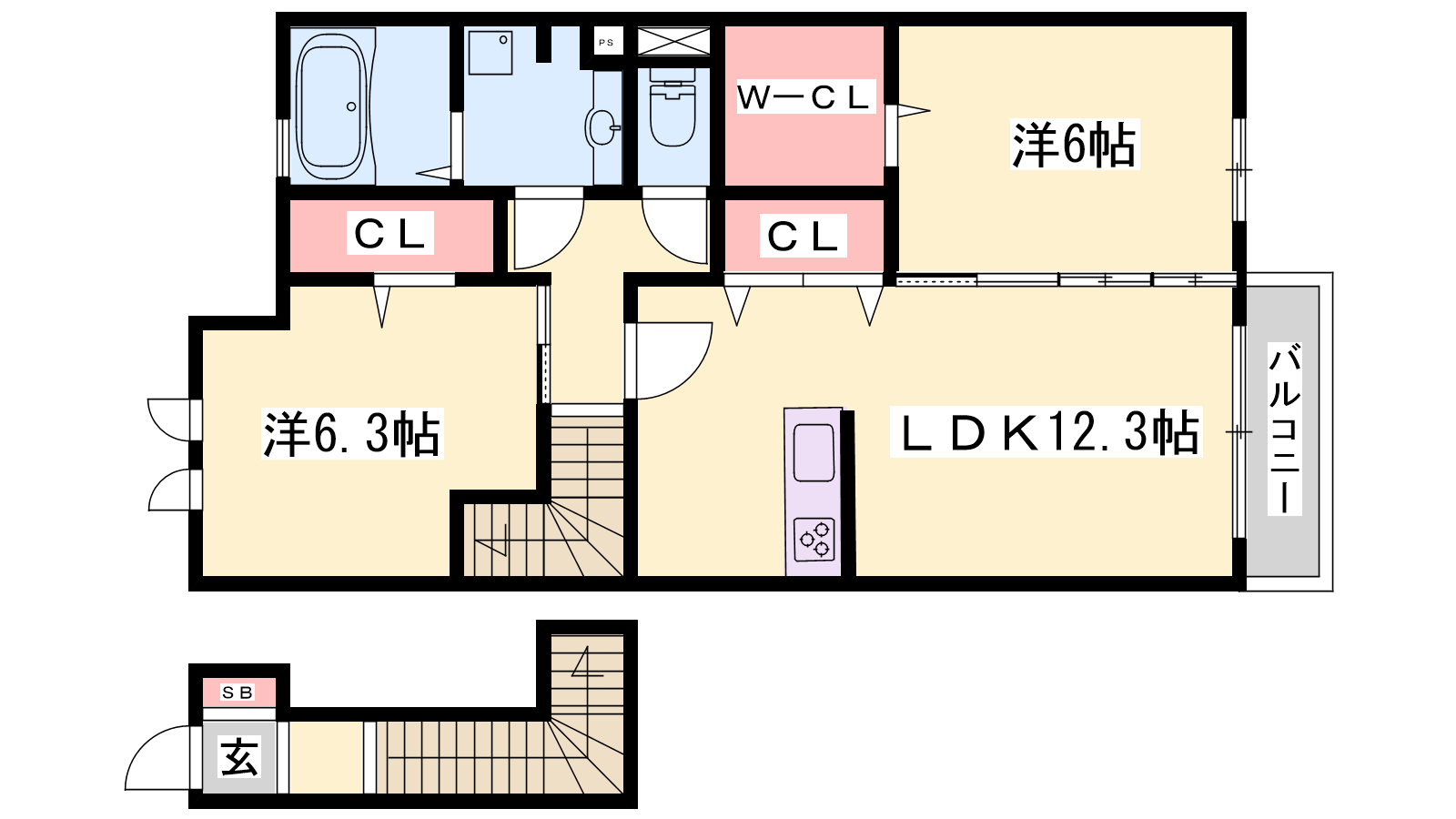 - LDK12.3帖、洋室6.3帖、洋室6帖