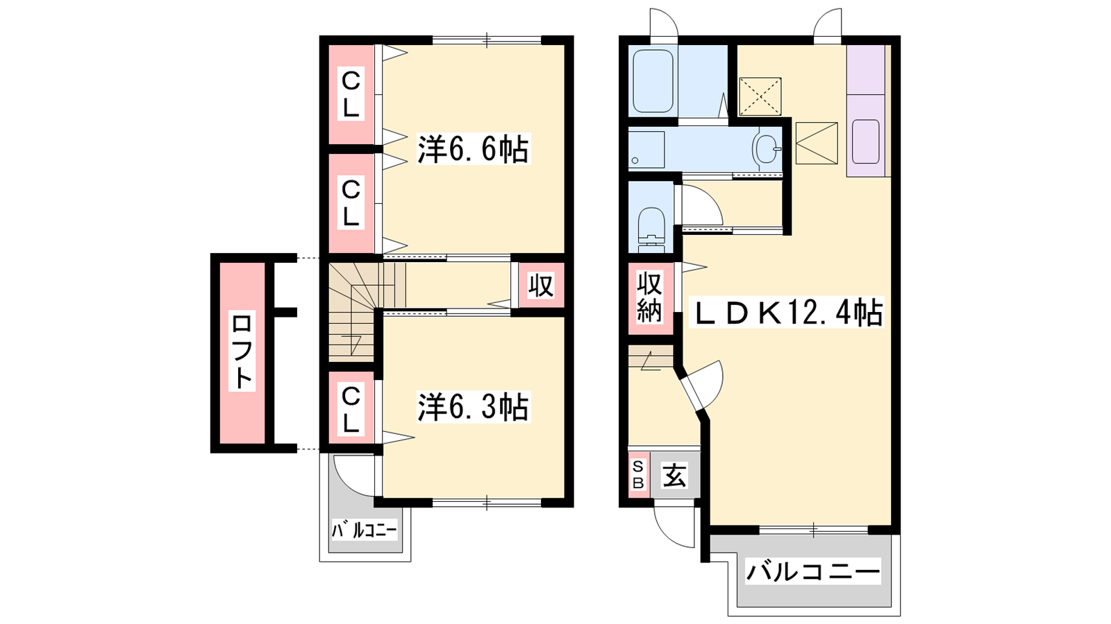 - LDK12.4帖、洋室6.6帖、洋室6.3帖